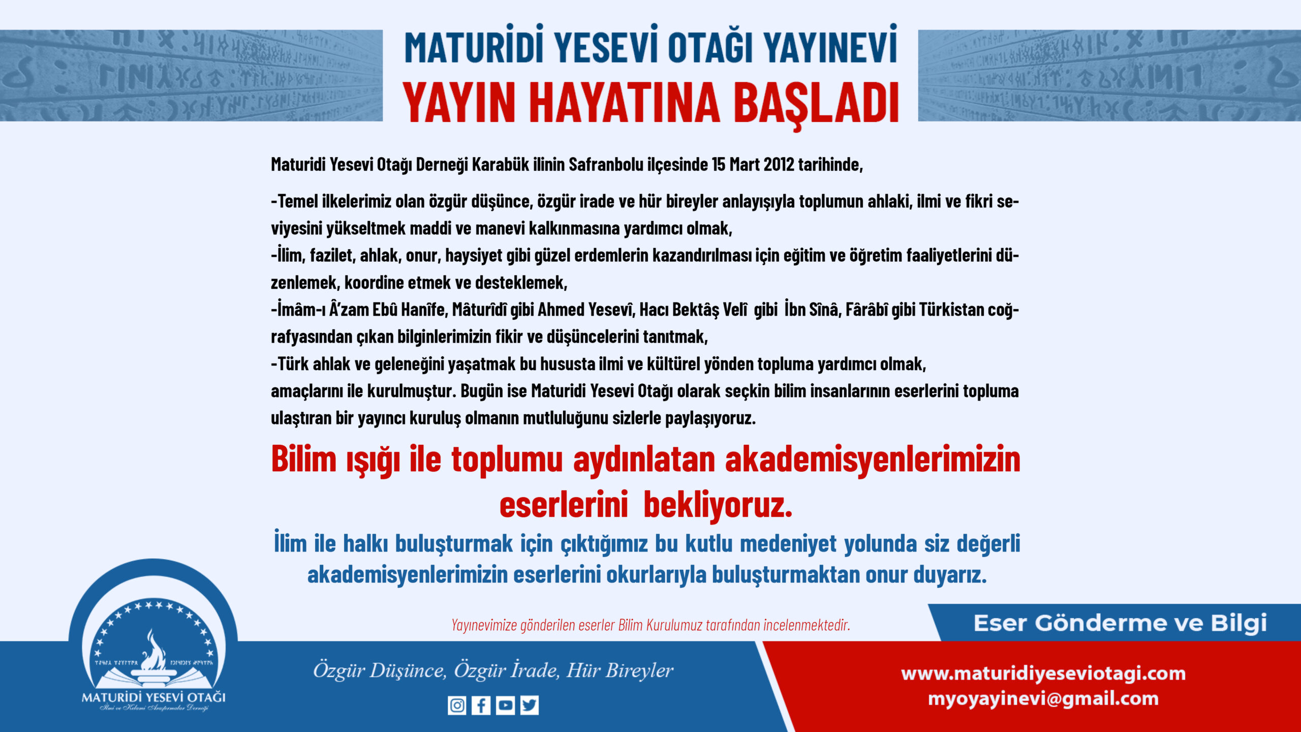 -Türk ahlak ve geleneğini yaşatmak bu hususta ilmi ve kültürel yönden topluma yardımcı olmak, amaçlarını ile kurulmuştur. Bugün ise Maturidi Yesevi Otağı olarak seçkin bilim insanlarının eserlerini topluma ulaştıran bir yayıncı kuruluş olmanın mutluluğunu sizlerle paylaşıyoruz.